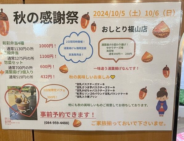 10月5日6日は感謝祭!美味しいお得がいっぱいです「梅の花おしとり福山店」