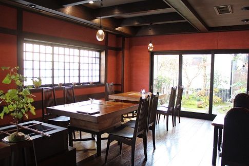 壁の色や建物の外側のえんじ色が効いてます